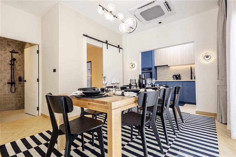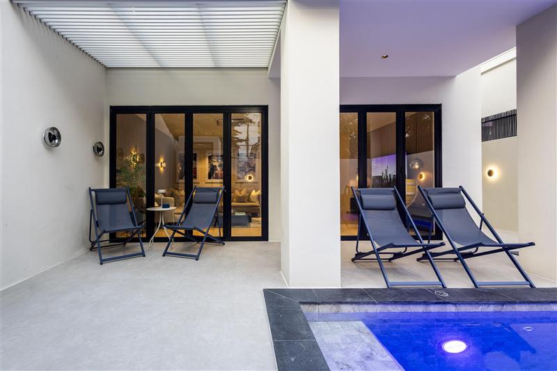 Modern Amenities: Guests enjoy air-conditioning, a terrace, balcony, and a fully equipped kitchen with modern appliances. Additional amenities include bathrobes, a washing machine, and a private pool. The outdoor seating area provides a relaxing space for leisure.